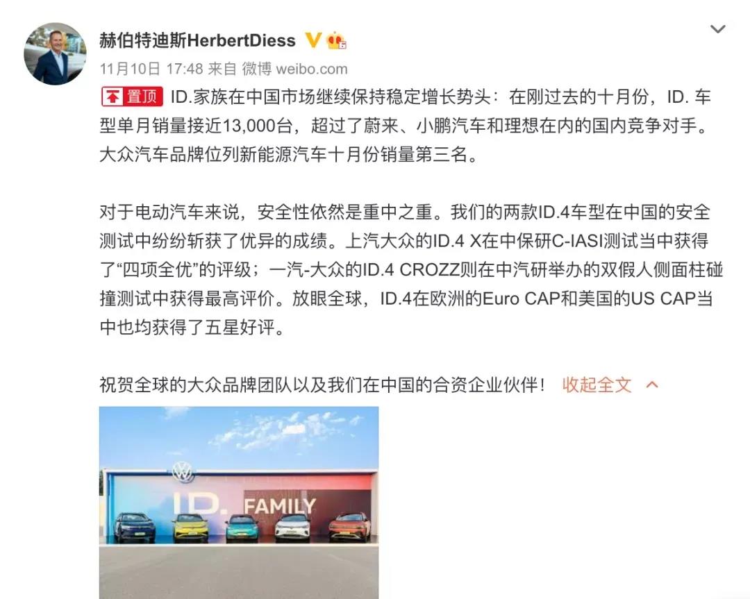 據(jù)了解,大眾旗下的德國工廠有茨維考工廠和德累斯頓工廠。而茨維考工廠主要負責生產大眾ID.3、ID.4、奧迪Q4 e-tron和Cupra Born等車型。值得注意的是,早幾日,大眾汽車集團迪斯在社交平臺發(fā)文表示,ID.家族在中國市場繼續(xù)保持穩(wěn)定增長勢頭,十月ID.車型單月銷量為12376臺,超過蔚來、小鵬汽車和理想等國內競爭對手。不能看出此次停產,也將導致這些車輛供應在短時間內受到限制。