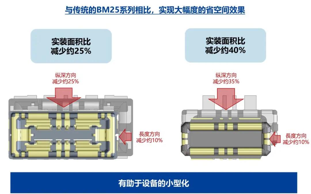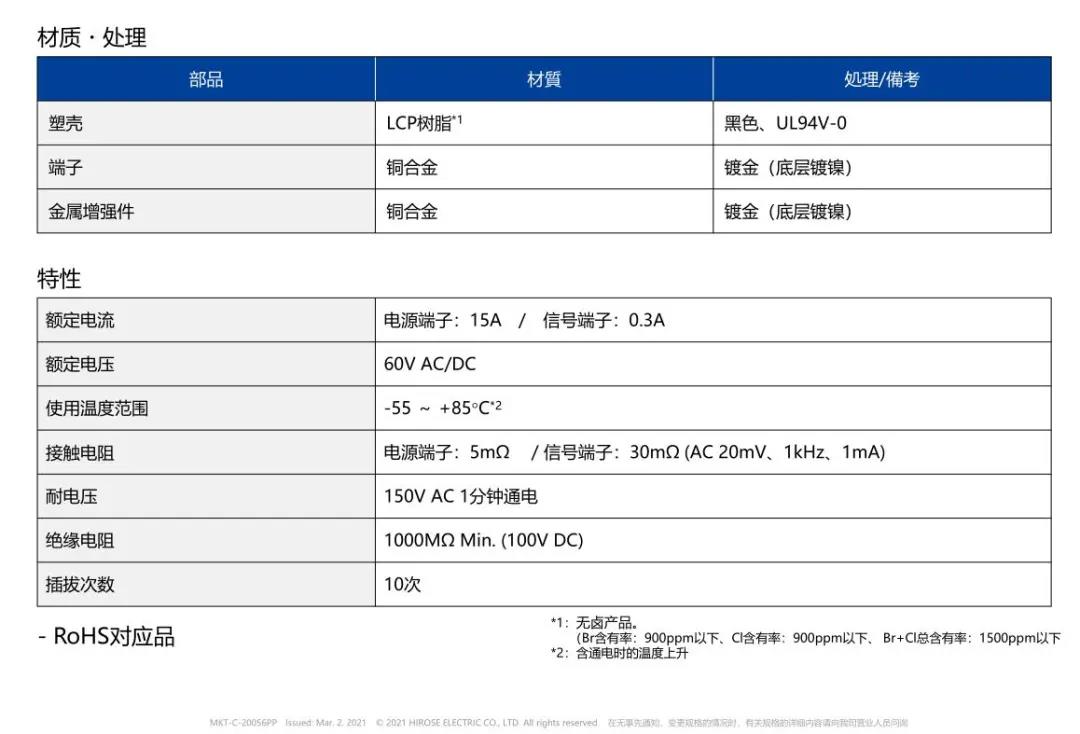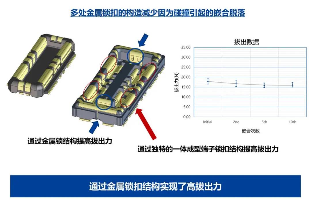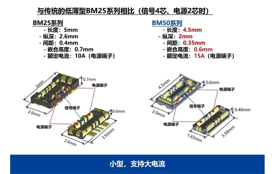 特點 1 兼顧供電能力和小型化的設計 - 額定電流:支持電源端子15A、信號端子0.3A - 嵌合高度:0.6mm、縱深:2.0mm 2 通過全包覆構造,確保高牢固性 3 使接觸電阻最小化,節(jié)省電力 4 實現(xiàn)小型,高抜出力 5 互相夾緊型多觸點構造,確保高接觸可靠性 有助于小型化&大電流化