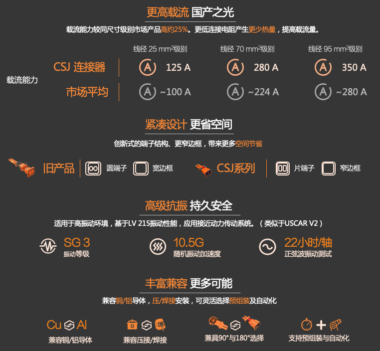 而對(duì)于中大型、大型電動(dòng)汽車的主干道連接,CSJ2100則可以作為超大電流與功率傳輸?shù)淖吭侥芰?dān)當(dāng)